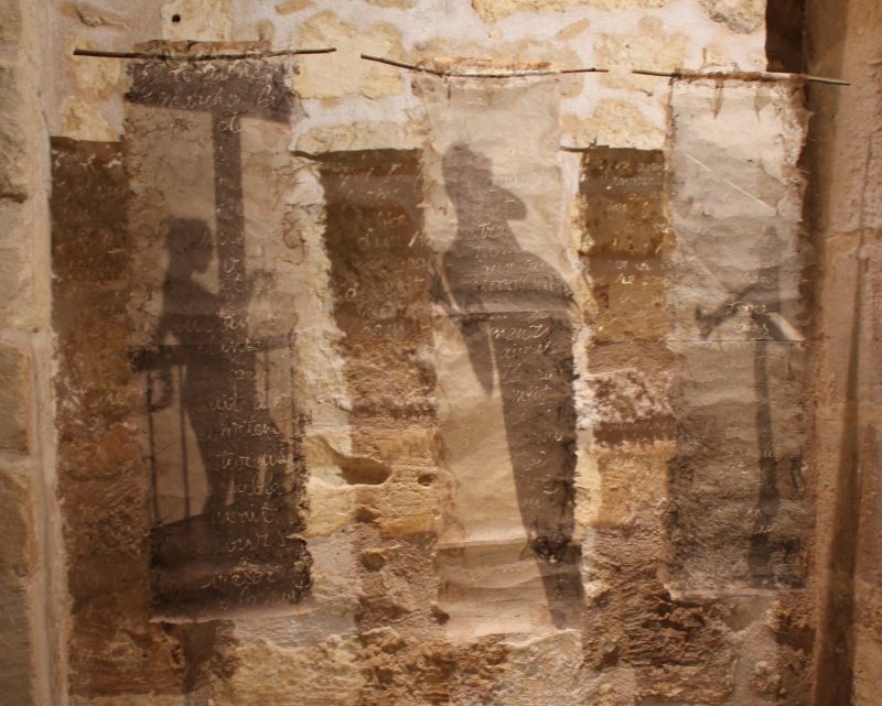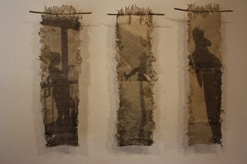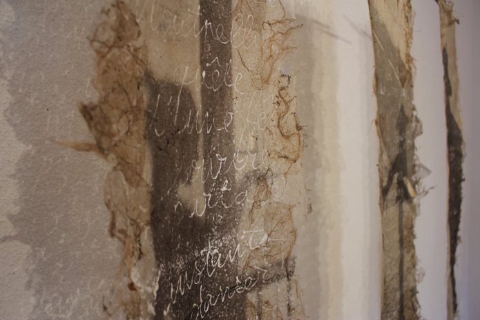 L’art papier développé par Aïdée Bernard joue avec l’écriture qui se dévoile par transparence et se projette grâce à l’ombre de la feuille sur le mur. Ici la perception habituelle du papier qui supporte l’écriture est inversée, l’écriture au contraire est là où les fibres sont enlevées, visible dans la lumière.