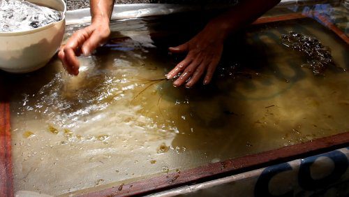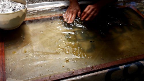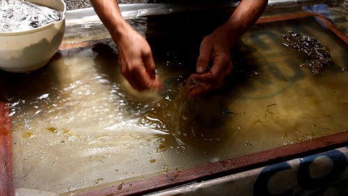Papier de fibres végétales tropicales, tronc de bananier, feuilles de cacaoyer et autres feuilles d’arbres tropicaux, extraites en lessive de cendres, tanins naturels, papier fait main.