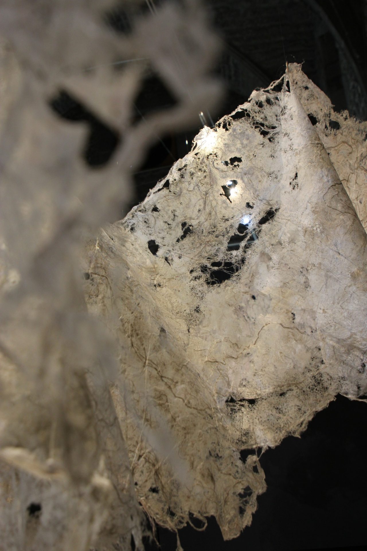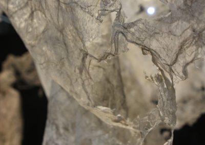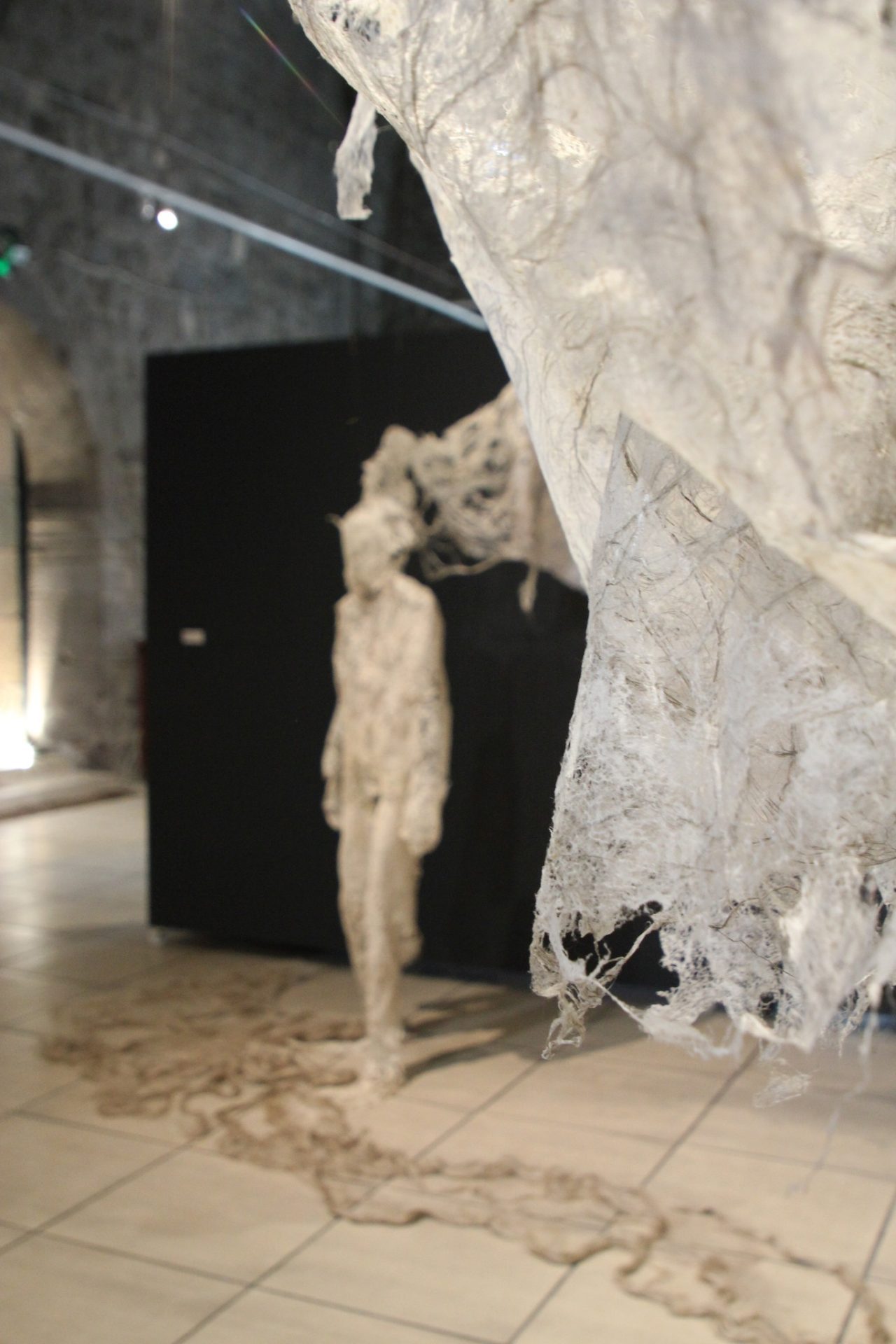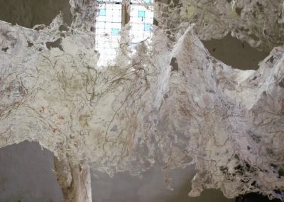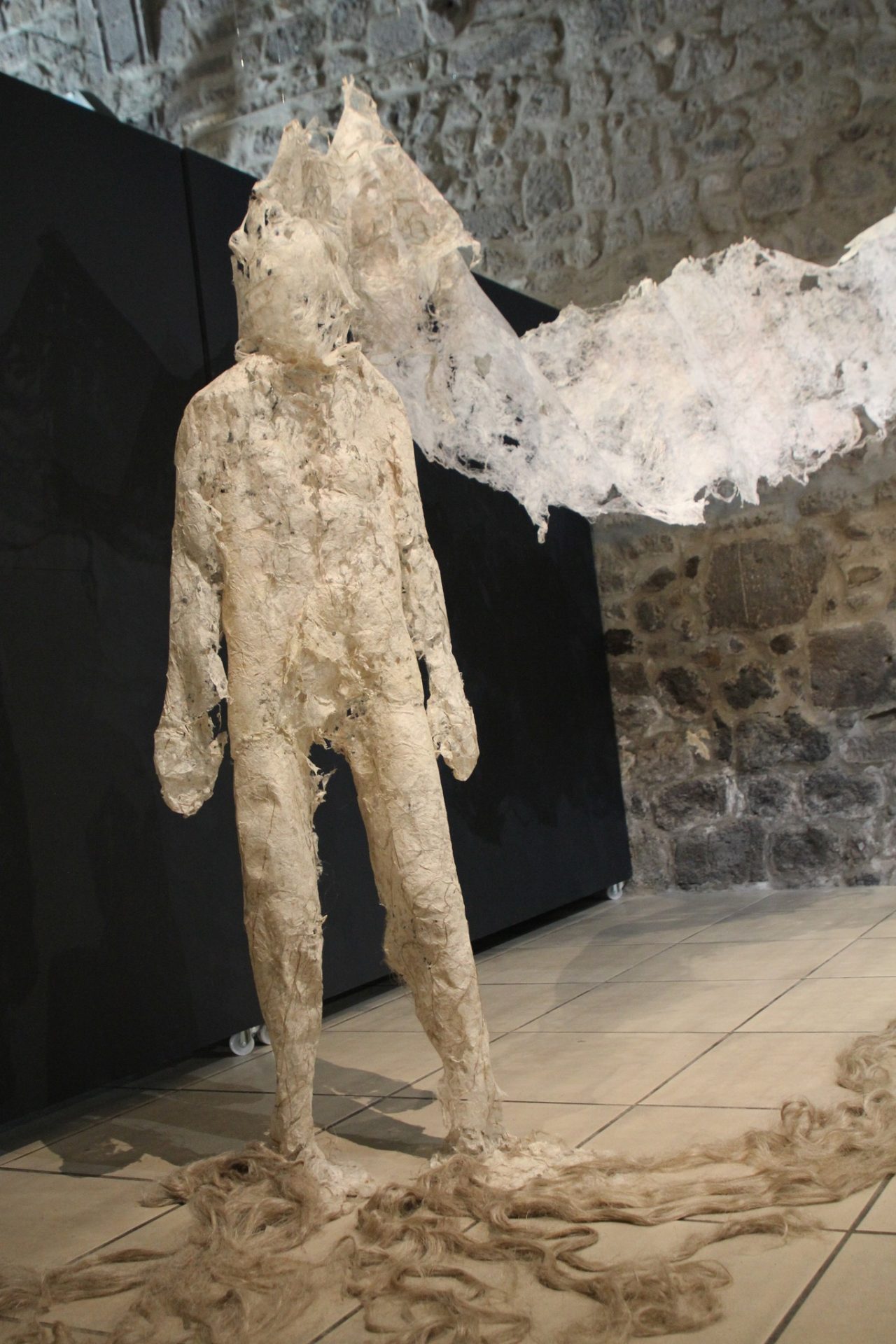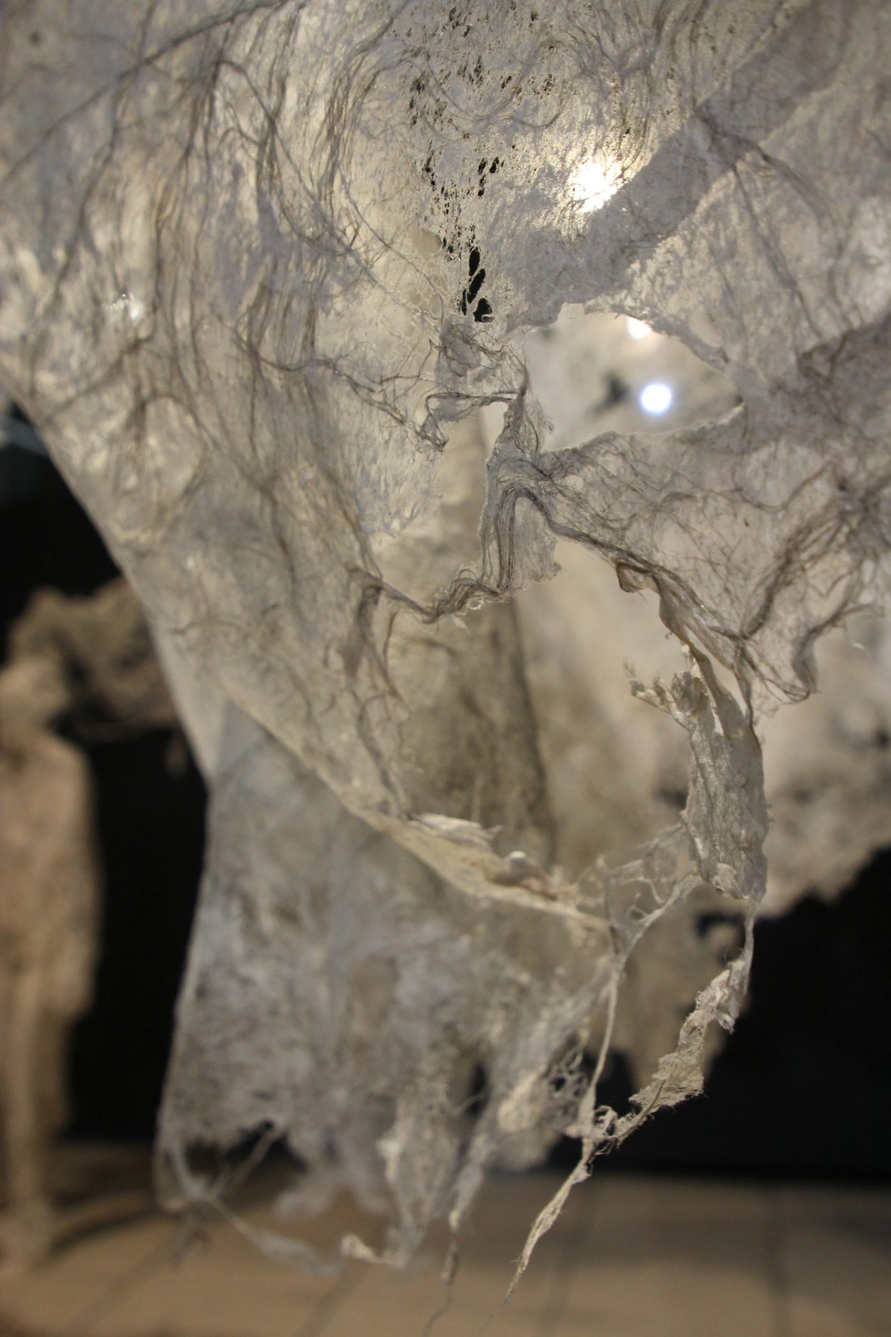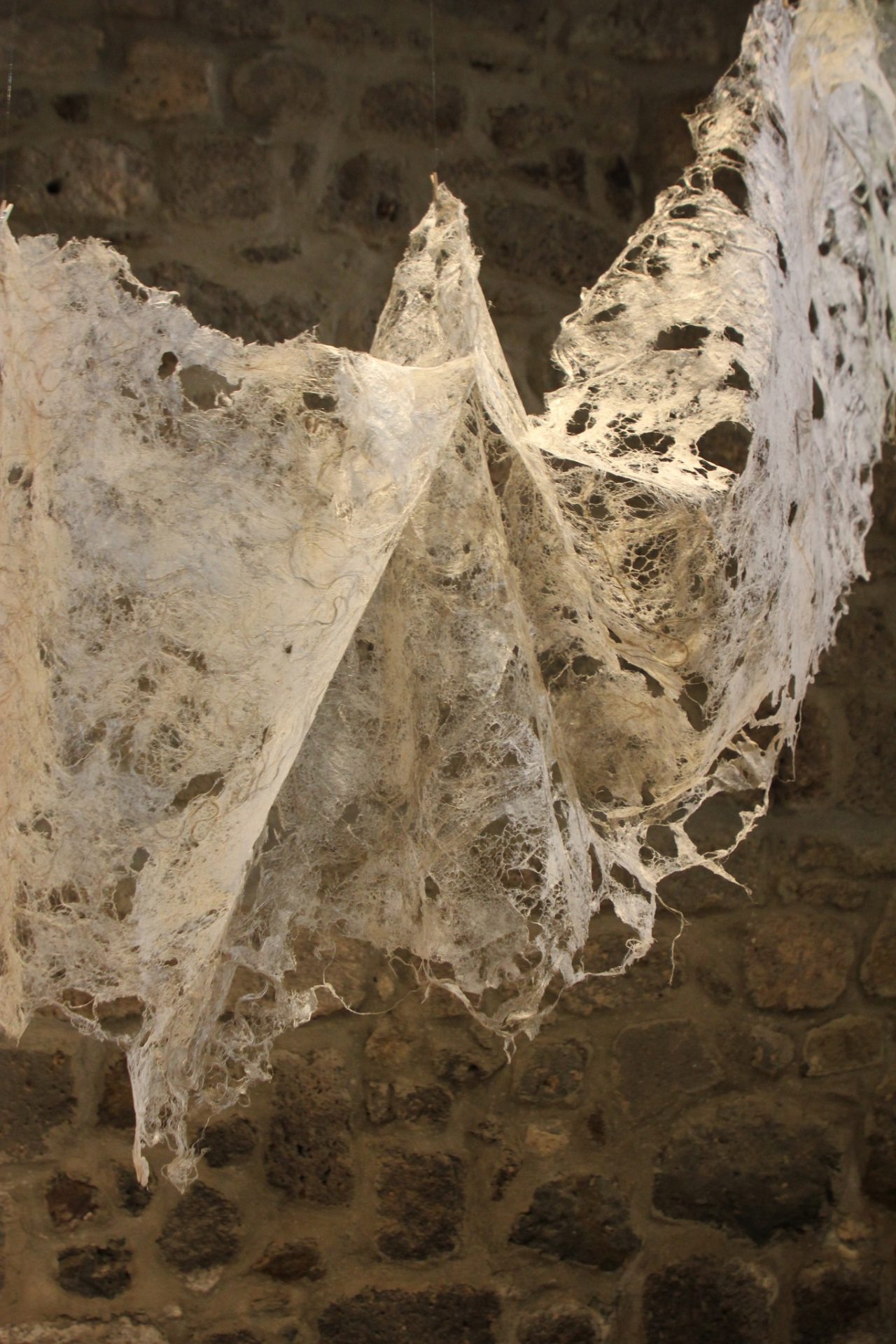 Fluide Installation en papier de fibres de celluloses de lin Œuvre en papier de fibres de lin, 1m de large, 12m de long avec une mue taille humaine.