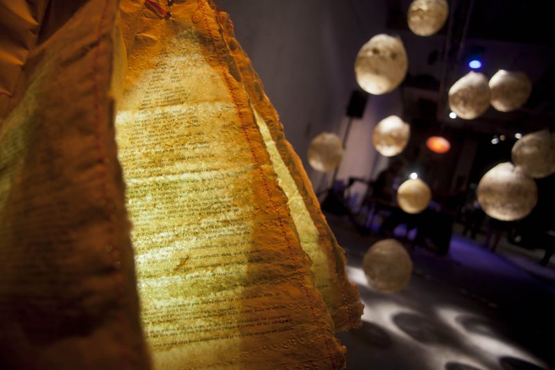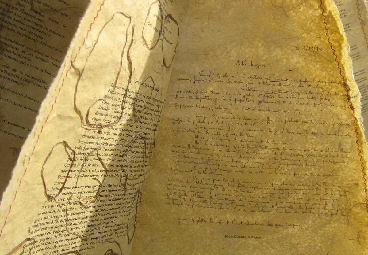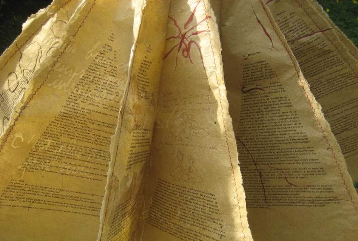 Ces mots ne peuvent se transcrire que sur le papier que je fabrique, avec des plantes locales, transformées par l’alchimie des cuissons, en celluloses. La cueillette des plantes, les différentes étapes de fabrication mobilisent mon corps, mes mains, un savoir-faire artisanal (œuvre de vie dont l’art se transmet dans le temps) et cela contribue à faire du papier naturel obtenu, une matière peau. Cette peau représentée est prête à recevoir les mots de ma renaissance à la relation.