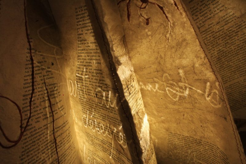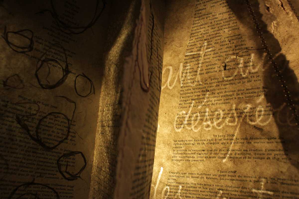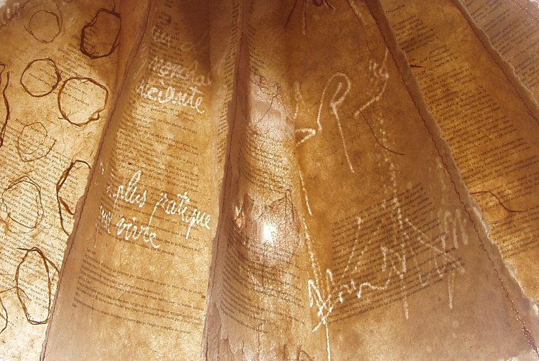Les papiers sont texturés de fibres battues pour une fabrication de papier « japon » d’une extrême finesse et de fibres entières, dentelles de feuille ou fibres teintées à la garance. Ils comportent des filigranes de calligraphies inventées et des empreintes de dentelles anciennes, fragiles, diaphanes, délicates. Ils sont ce voile protecteur, sublimé, d’un corps qui retrouve la candeur de l’adolescente désirée, aimant être regardée, muse distante.