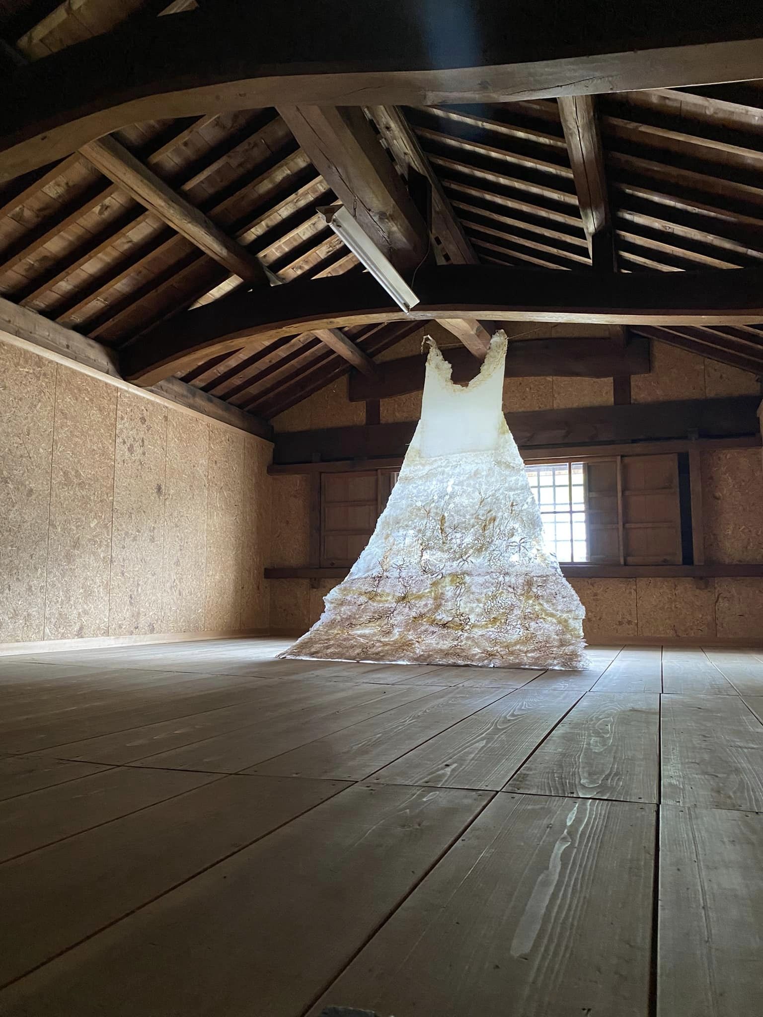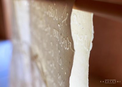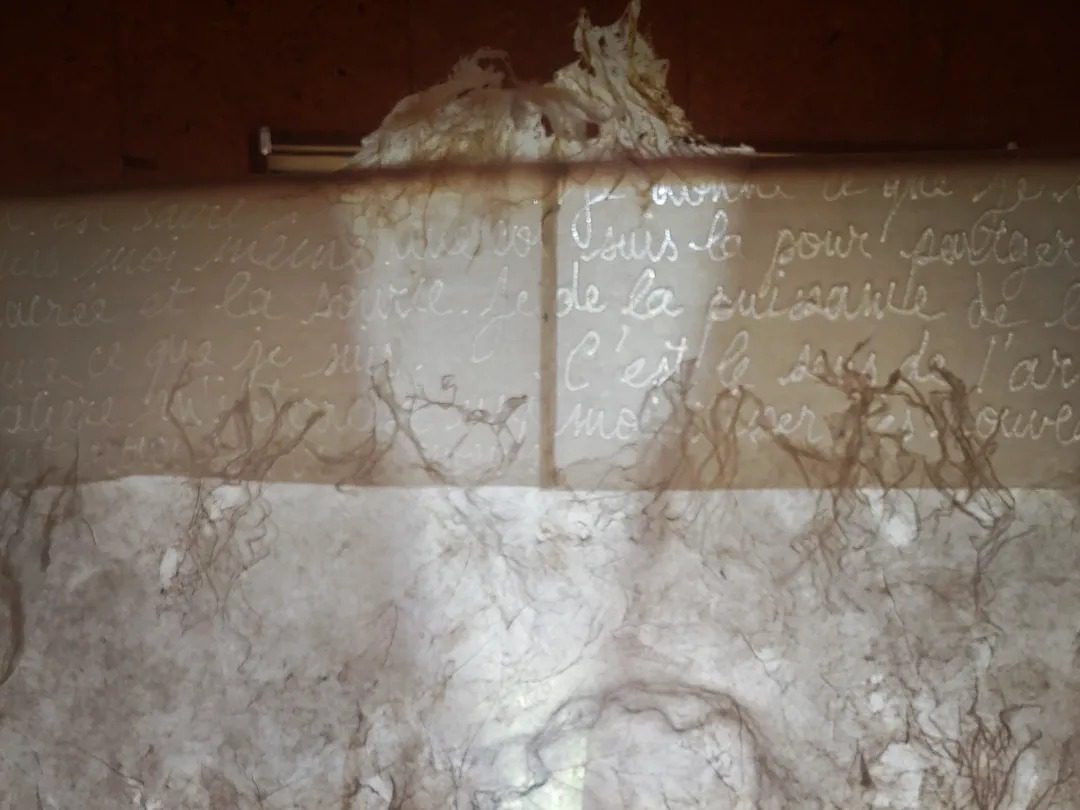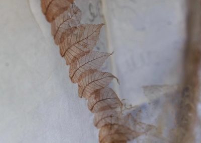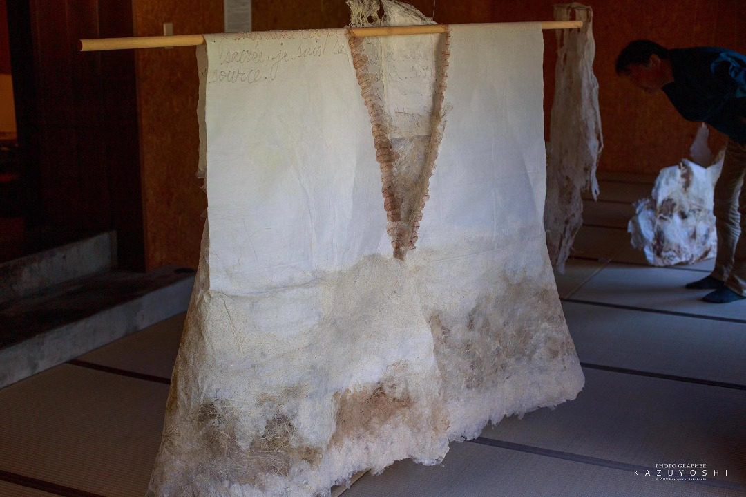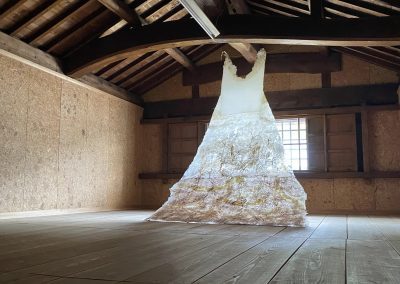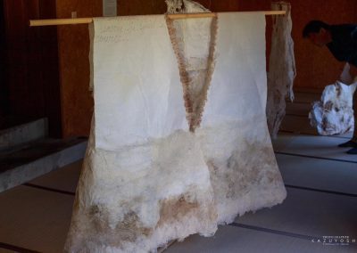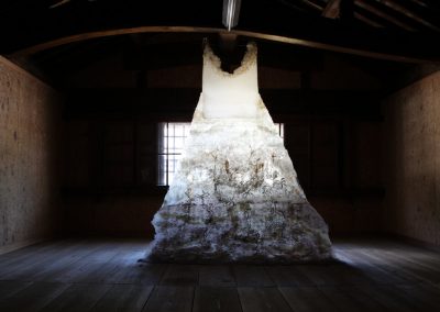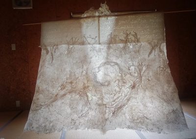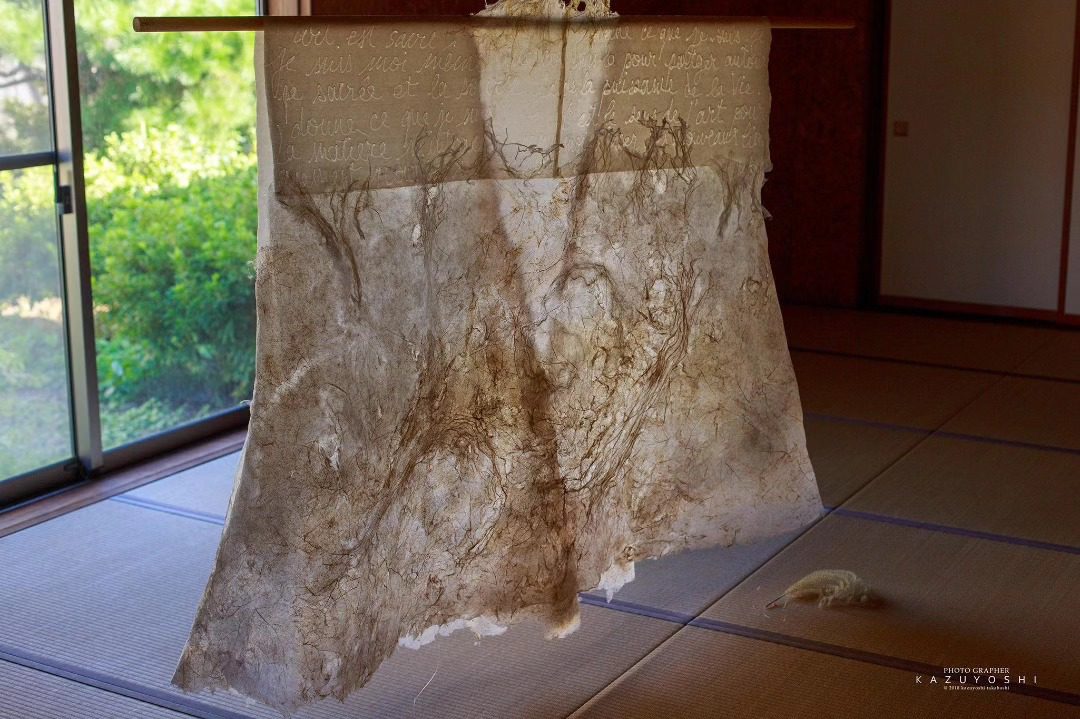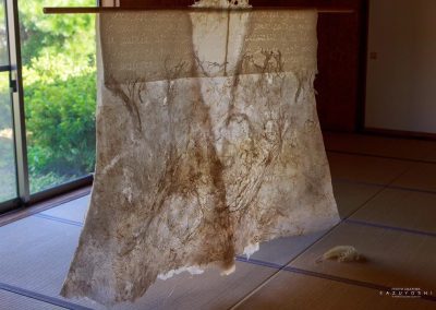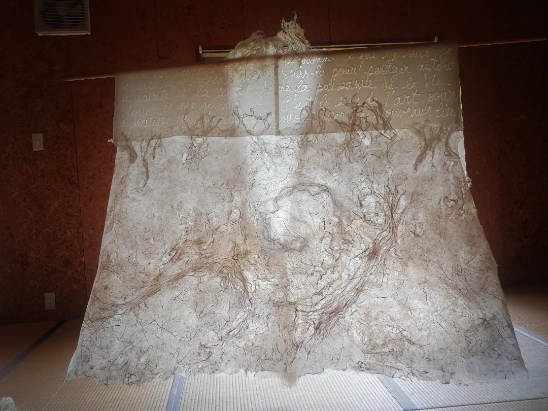 A l’invitation d’Imadate Art Field, association organisatrice d’un événement d’art papier contemporain au village des papetiers d’Achizen au Japon, Aïdée Bernard réalise un hommage au papier traditionnel, le washi. qui va servir de base aux œuvres qu’elle a créées pendant la résidence. On retrouve dans ses créations, l’empreinte et la forme du tamis de bambou, la pureté de la fibre finement lissée par son bercement dans la cuve d’eau et de néri. Aïdée Bernard va ensuite ajouter d’autres fibres, qu’elle glâne dans le village ou sur le chemin du sanctuaire shinto de kawakami gozen, la déesse du papier, dans la montagne toute proche, tel l’aubier du cèdre du japon, des graminées, le susuki, le kudzu, le chataigner, le charme houblon, etc.. Toutes en textures et en teintes naturelles, issues des végétaux.