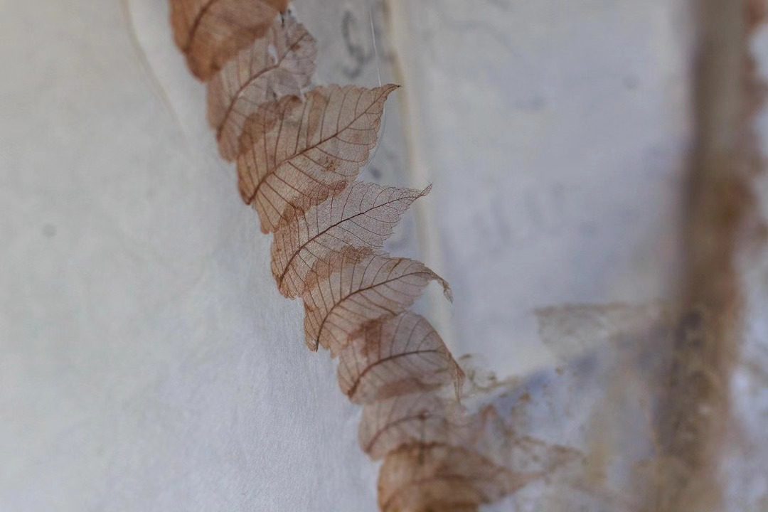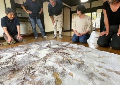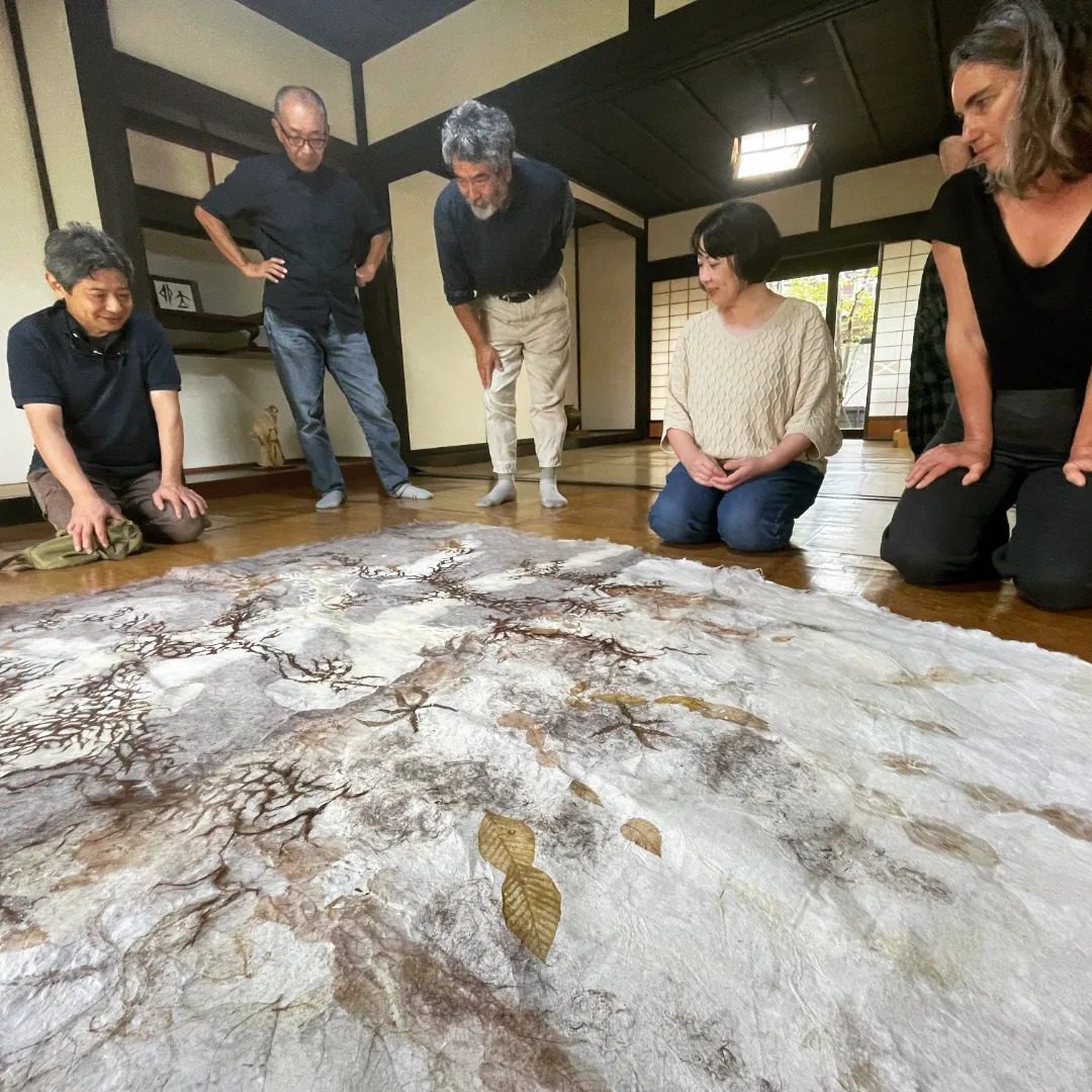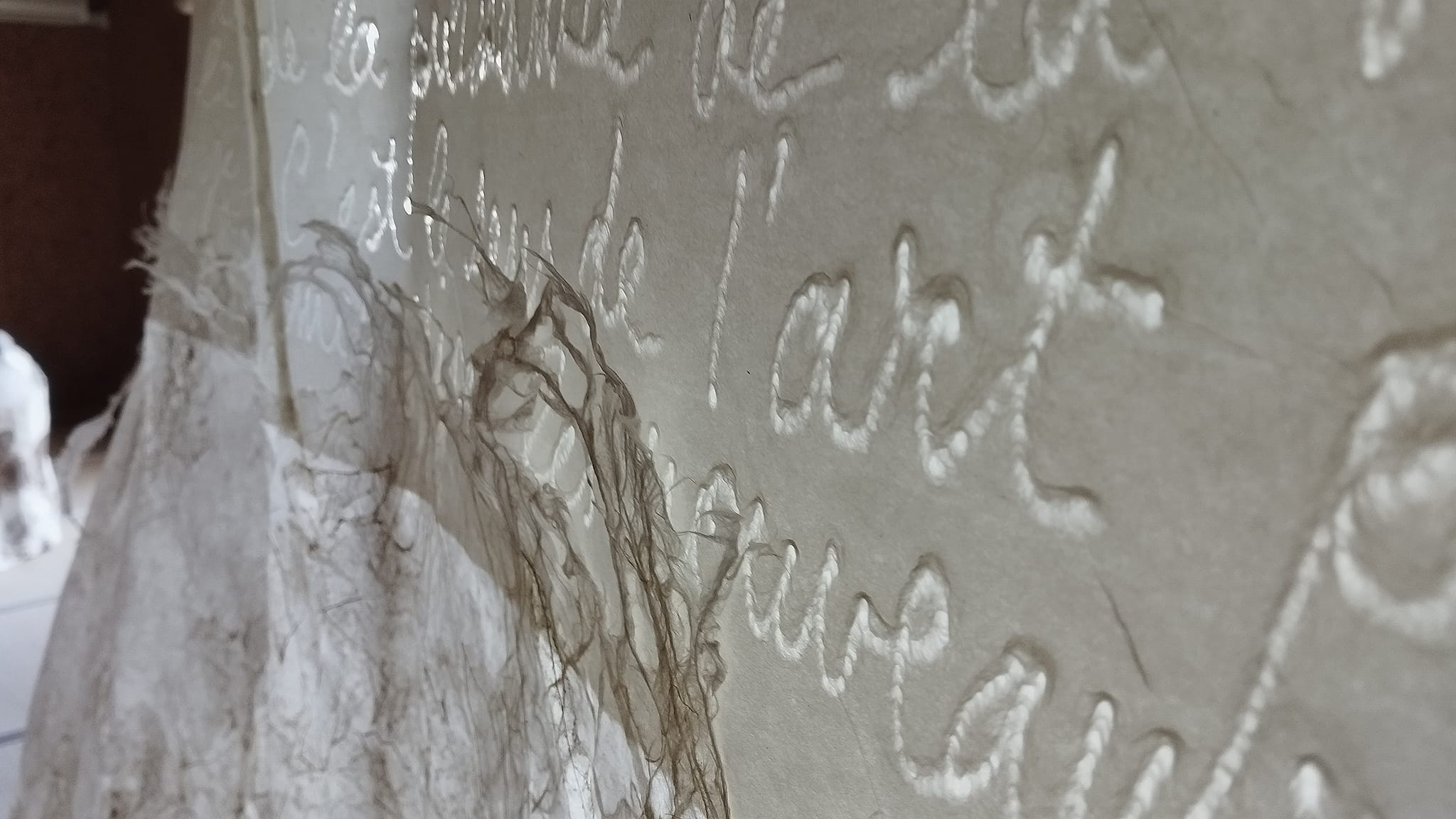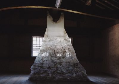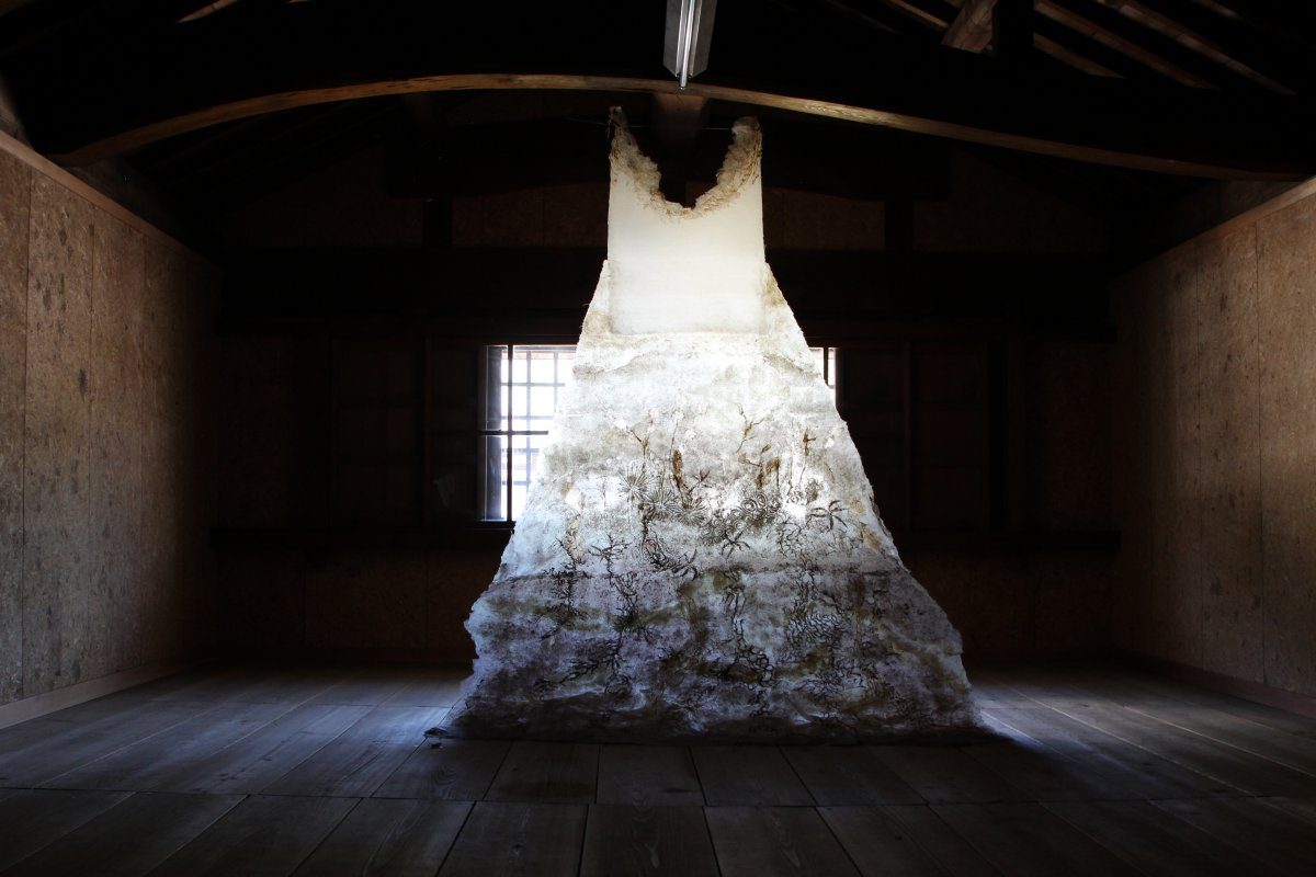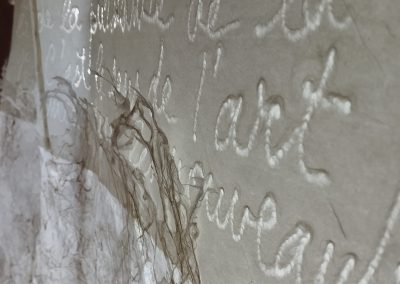A l’invitation d’Imadate Art Field, association organisatrice d’un événement d’art papier contemporain au village des papetiers d’Achizen au Japon, Aïdée Bernard réalise un hommage au papier traditionnel, le washi. qui va servir de base aux œuvres qu’elle a créées pendant la résidence. On retrouve dans ses créations, l’empreinte et la forme du tamis de bambou, la pureté de la fibre finement lissée par son bercement dans la cuve d’eau et de néri. Aïdée Bernard va ensuite ajouter d’autres fibres, qu’elle glâne dans le village ou sur le chemin du sanctuaire shinto de kawakami gozen, la déesse du papier, dans la montagne toute proche, tel l’aubier du cèdre du japon, des graminées, le susuki, le kudzu, le chataigner, le charme houblon, etc.. Toutes en textures et en teintes naturelles, issues des végétaux.