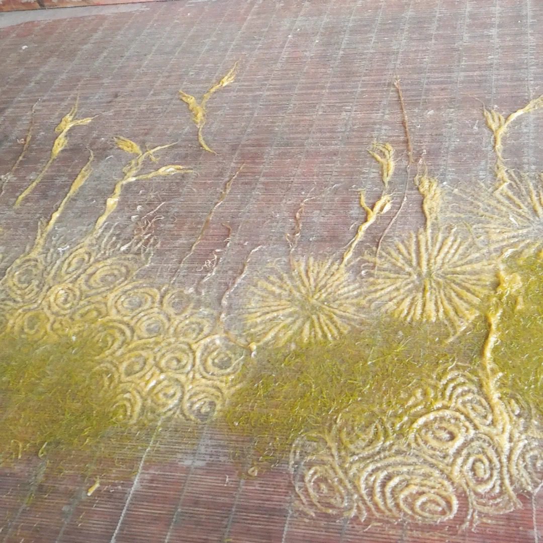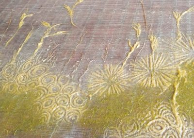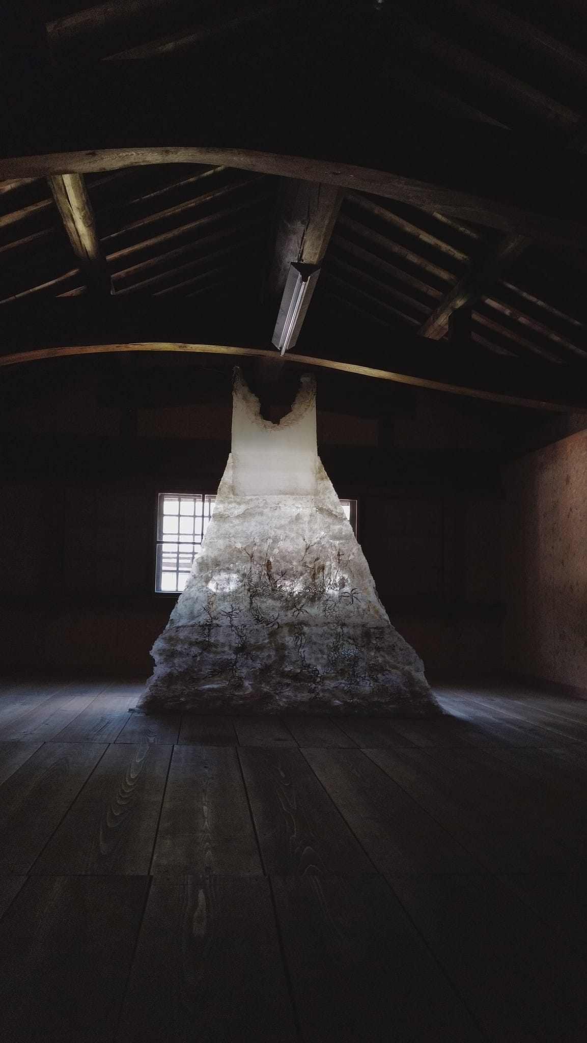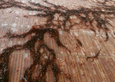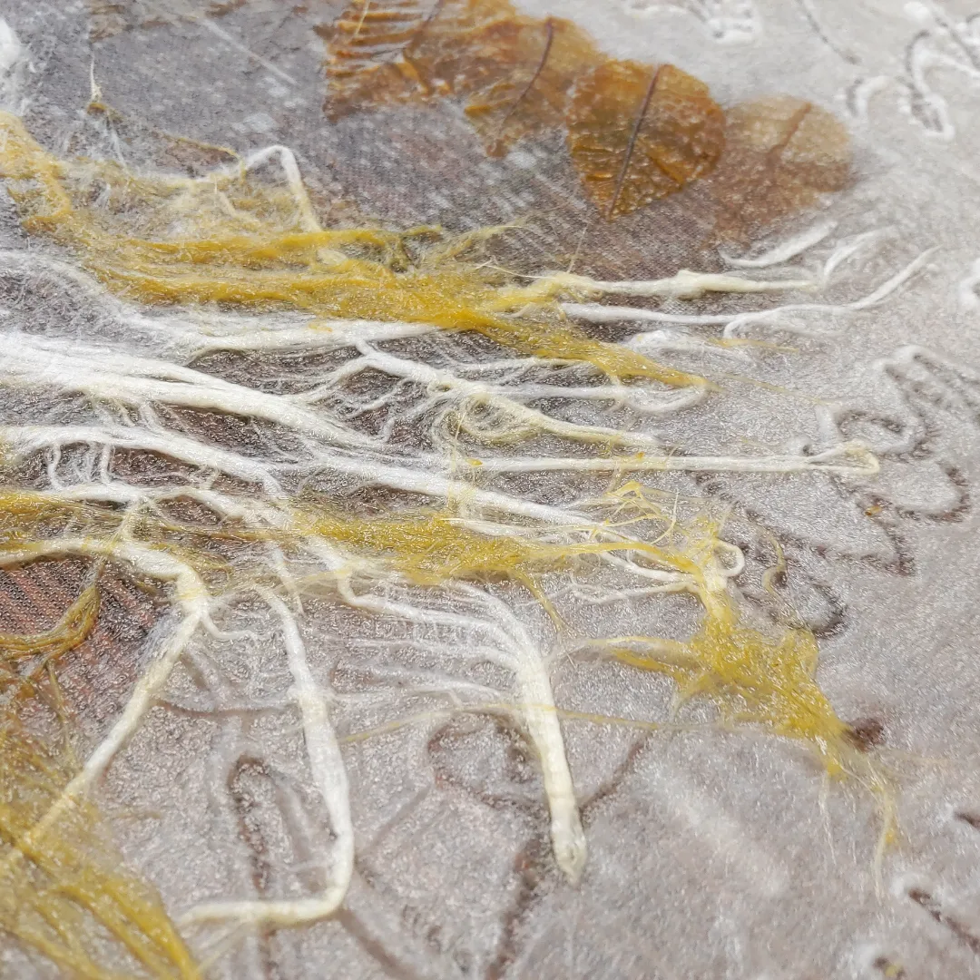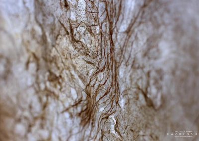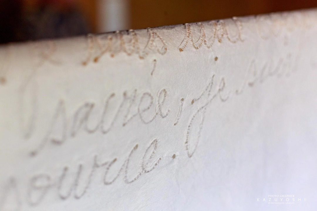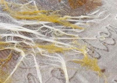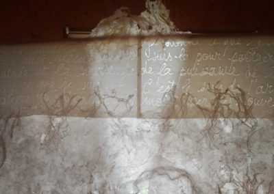 A l’invitation d’Imadate Art Field, association organisatrice d’un événement d’art papier contemporain au village des papetiers d’Achizen au Japon, Aïdée Bernard réalise un hommage au papier traditionnel, le washi. qui va servir de base aux œuvres qu’elle a créées pendant la résidence. On retrouve dans ses créations, l’empreinte et la forme du tamis de bambou, la pureté de la fibre finement lissée par son bercement dans la cuve d’eau et de néri. Aïdée Bernard va ensuite ajouter d’autres fibres, qu’elle glâne dans le village ou sur le chemin du sanctuaire shinto de kawakami gozen, la déesse du papier, dans la montagne toute proche, tel l’aubier du cèdre du japon, des graminées, le susuki, le kudzu, le chataigner, le charme houblon, etc.. Toutes en textures et en teintes naturelles, issues des végétaux.