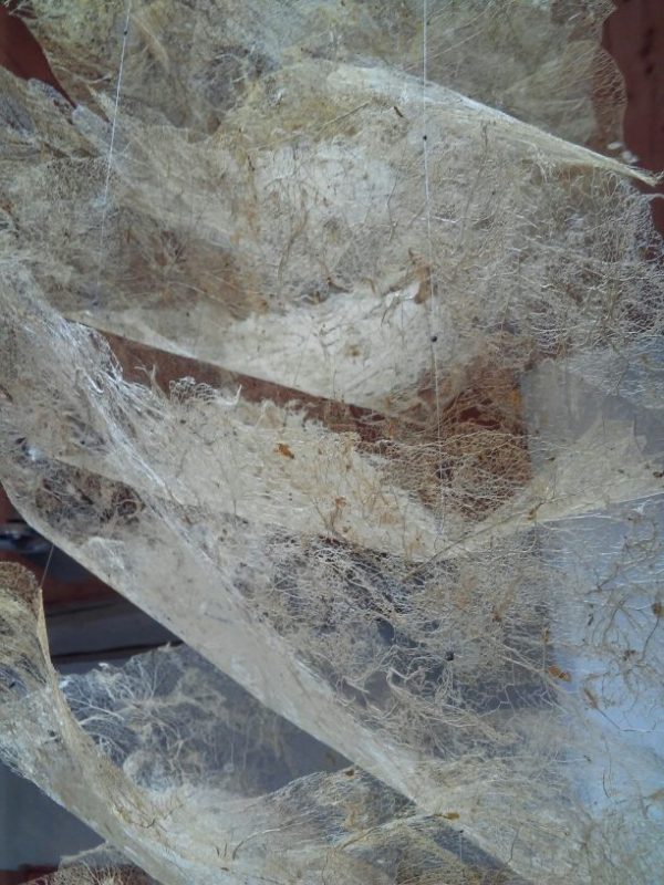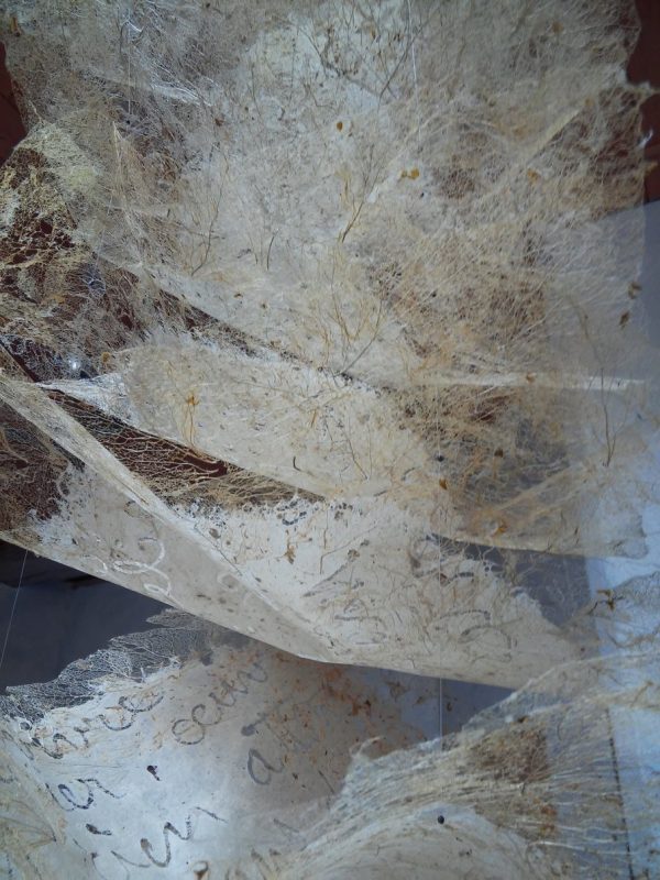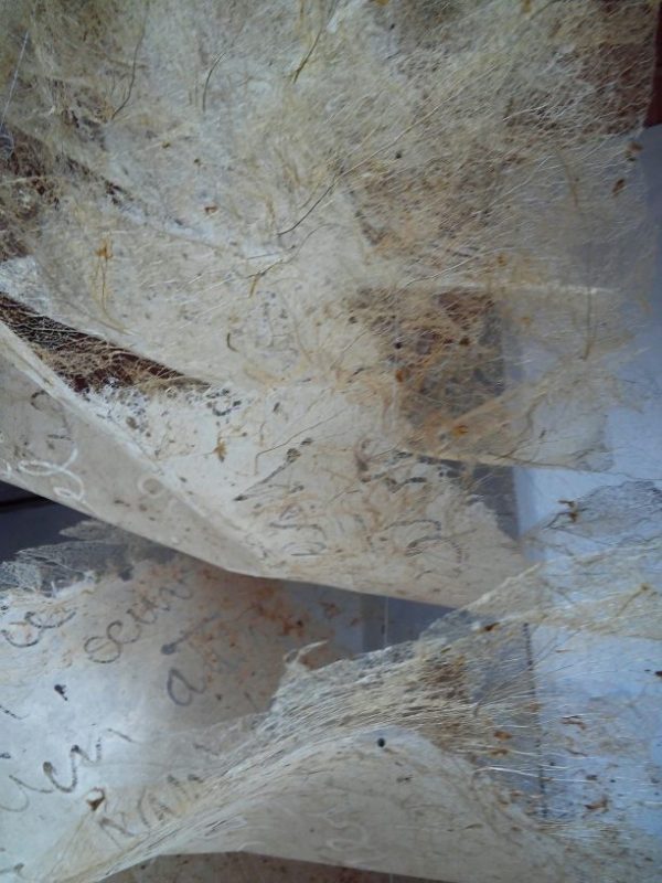 La matière du papier petit à petit s’amenuise et le texte écrit en filigrane laisse place à des feuilles de dentelles végétales de lierre.