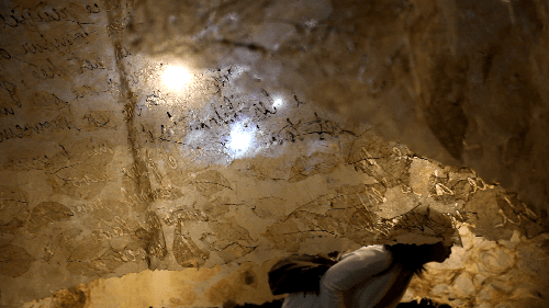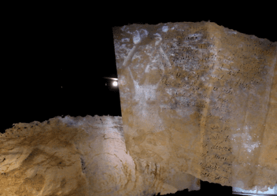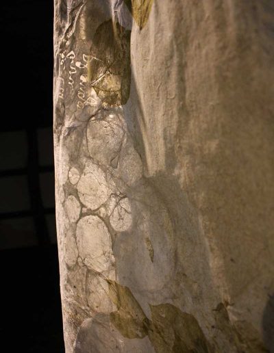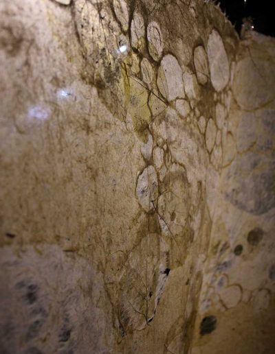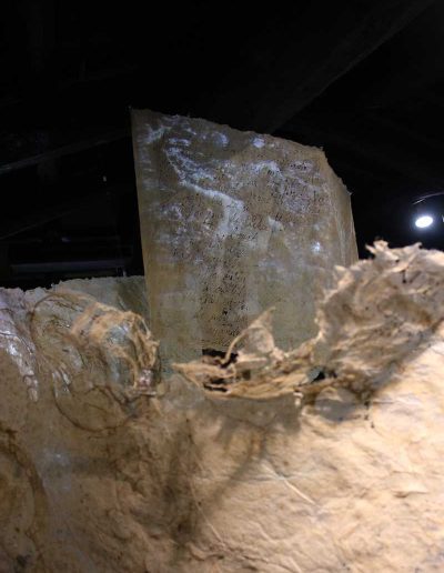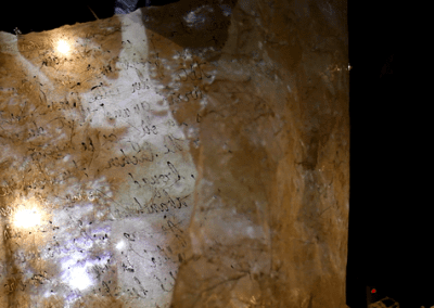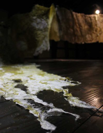 L’œuvre de 16 m de long et 1m de large s’élève du sol en spiralant. Sur la partie la plus haute j’ai projeté un film où apparaît sur fond d’écriture en filigrane et de dentelles de feuilles de kozo, un personnage féminin grandeur nature. Le public est invité à pénétrer à l’intérieur de l’œuvre, comme à l’intérieur d’une membrane.