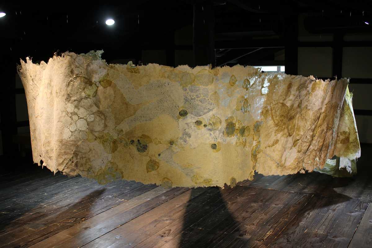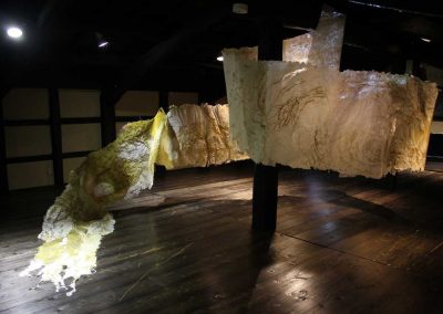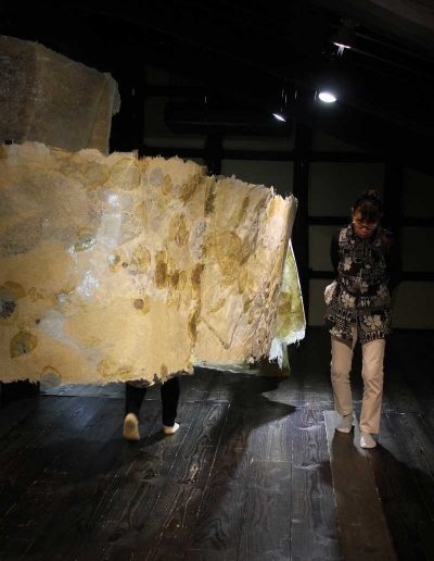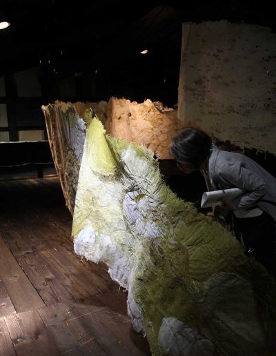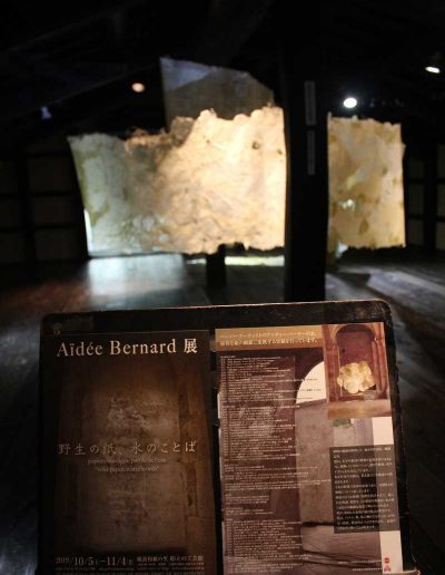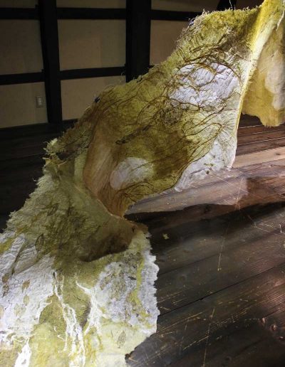 Invitée par Imadate Art Field organisateur d’un événement d’art papier contemporain dans le village des artisans papetiers d’Echizen au Japon, à l’occasion des 1300 ans du temple Otaki, dédié à Kawakami Gozen, la déesse du papier qui leur a transmis le secret de la fabrication du papier, j’ai créé à partir des plantes locales, riz, herbes sauvages comme le susuki, sasa, kuzu ou thé, et de la légende de cette déesse. L’eau si indispensable à la formation du papier a été mon fil conducteur.