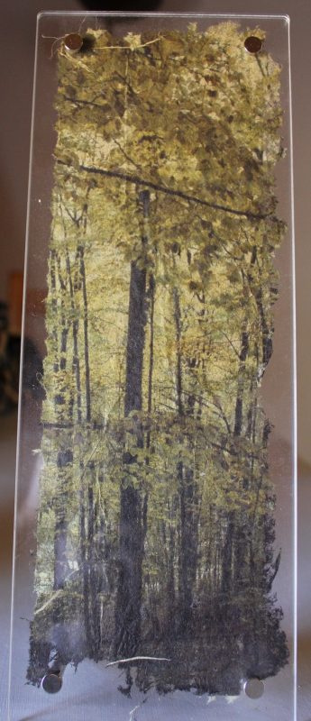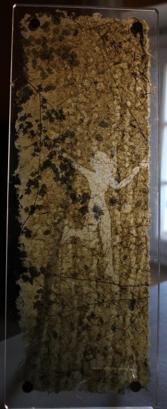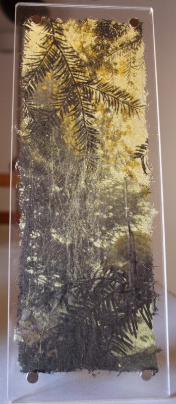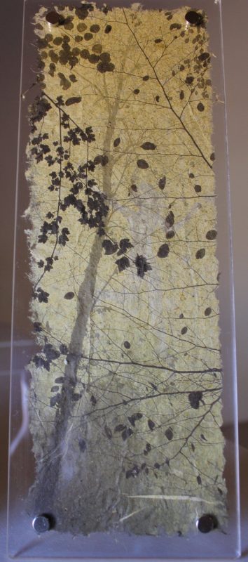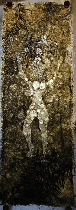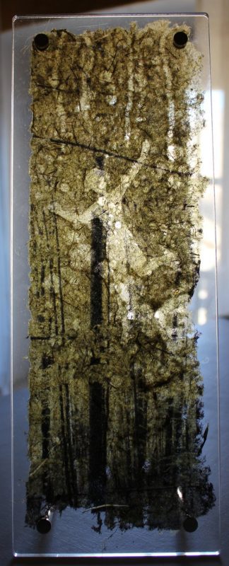 Tableaux en papier fait-main de fibres de celluloses de roseaux et graminées, avec personnage en filigrane et estampe numérique d’une photographie de Mona Maire.