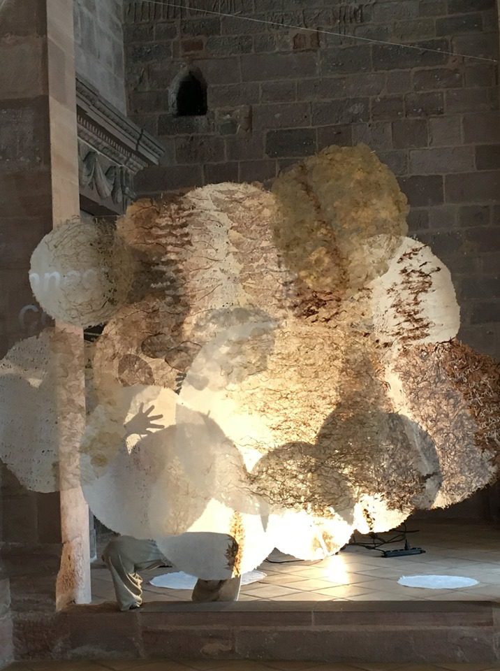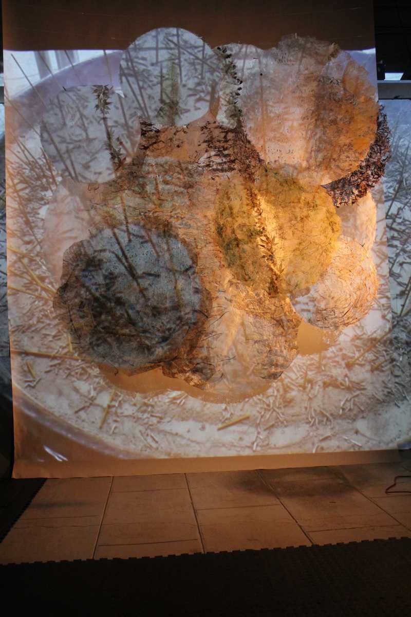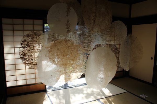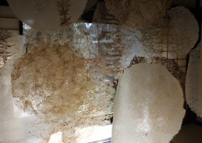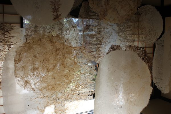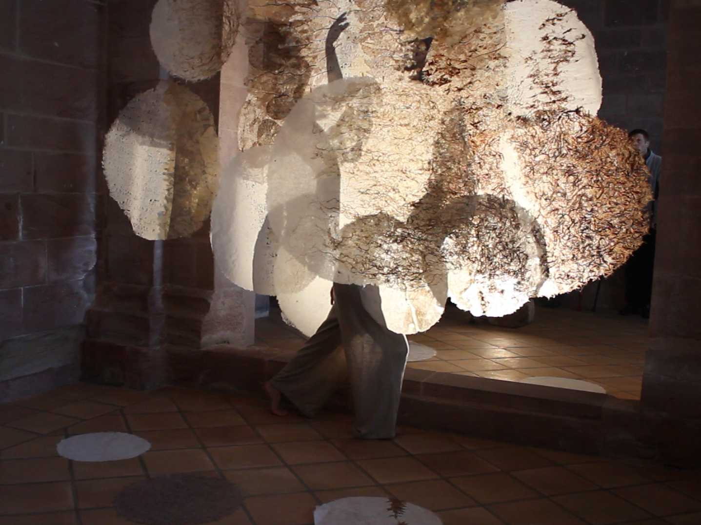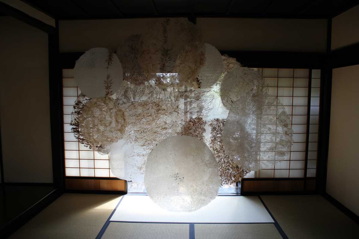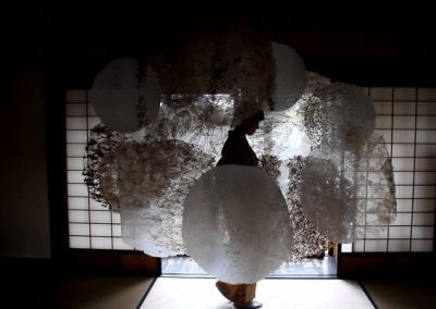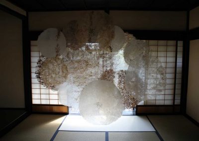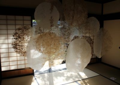 Installation d’une douzaine de disques de papiers en fibres de plantes japonaises : kozo, cèdre, kudzu, érable japonais, gingko biloba, thé, arbre de Judée, magnolia (hoba), … Éclairage par la projection d’une vidéo réalisée au Japon. Performance dansée par Aïdée Bernard. Réalisé pendant un voyage au Japon.