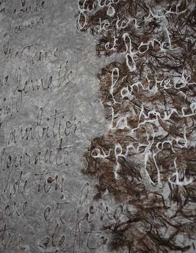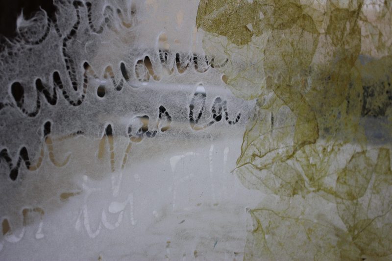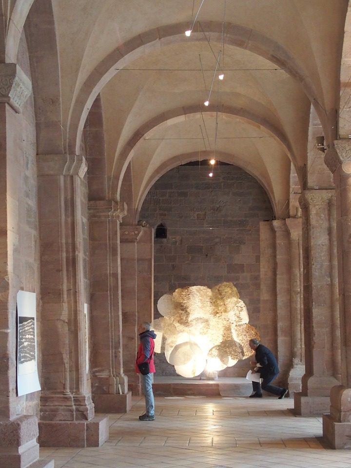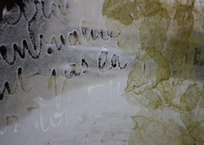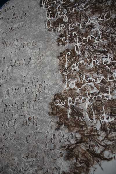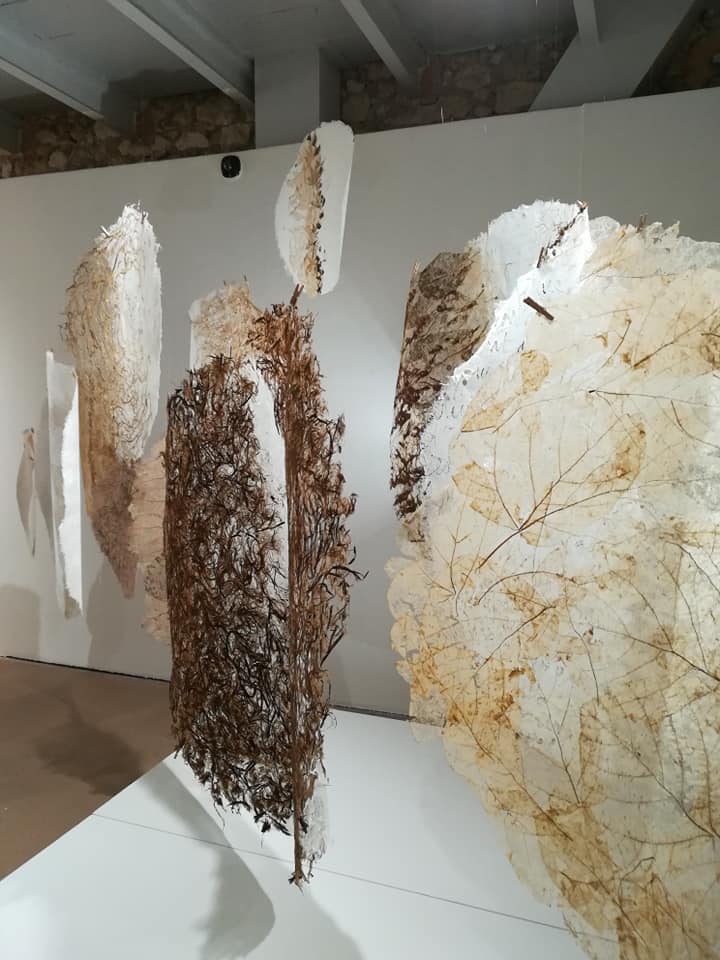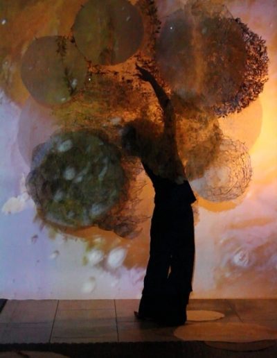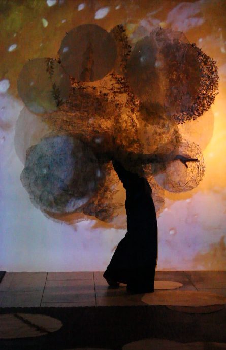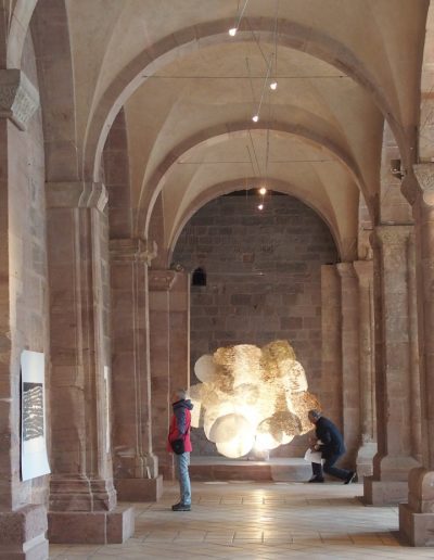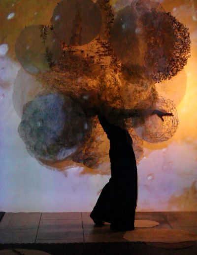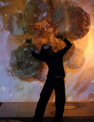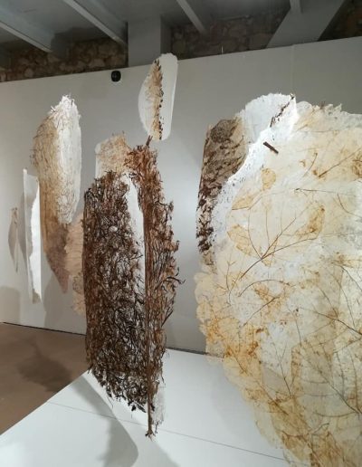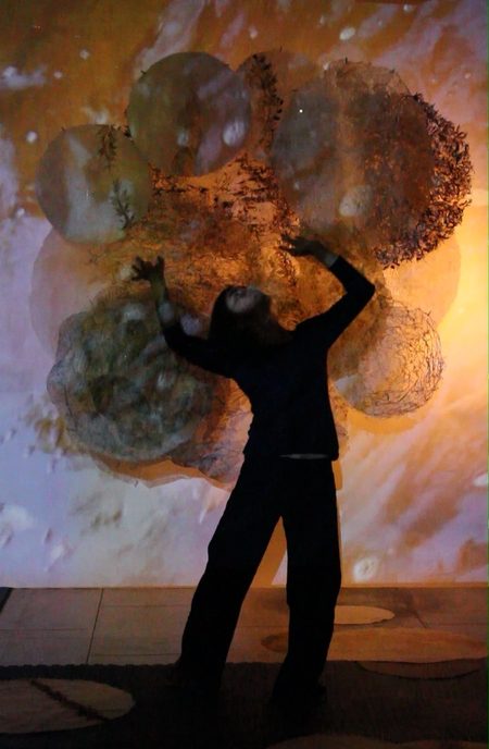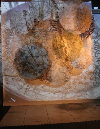 Installation d’une douzaine de disques de papiers en fibres de plantes japonaises : kozo, cèdre, kudzu, érable japonais, gingko biloba, thé, arbre de Judée, magnolia (hoba), … Éclairage par la projection d’une vidéo réalisée au Japon. Performance dansée par Aïdée Bernard. Réalisé pendant un voyage au Japon.