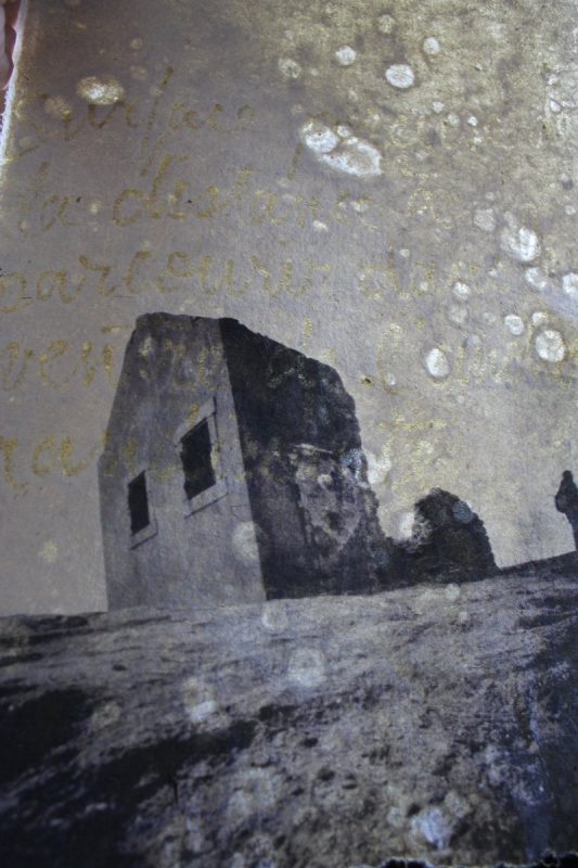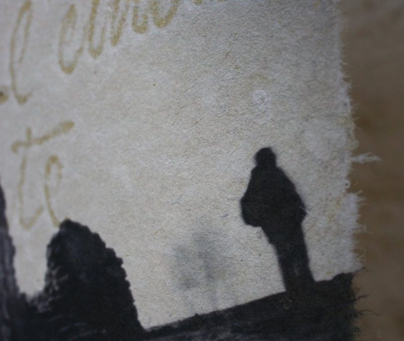 Dans le ventre de l’émotion « Surface poreuse de la distance à parcourir dans le ventre de l’émotion grandissante. » Impression d’une photo d’Arnaud Piette sur papier chiffon et canne de Provence avec filigrane au jet d’eau.