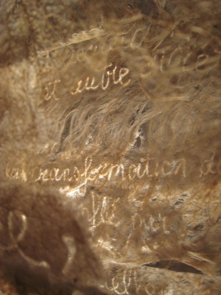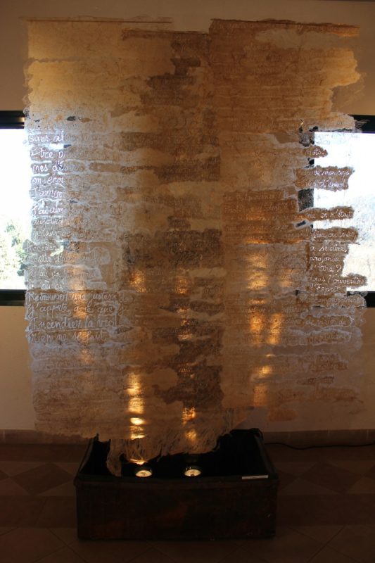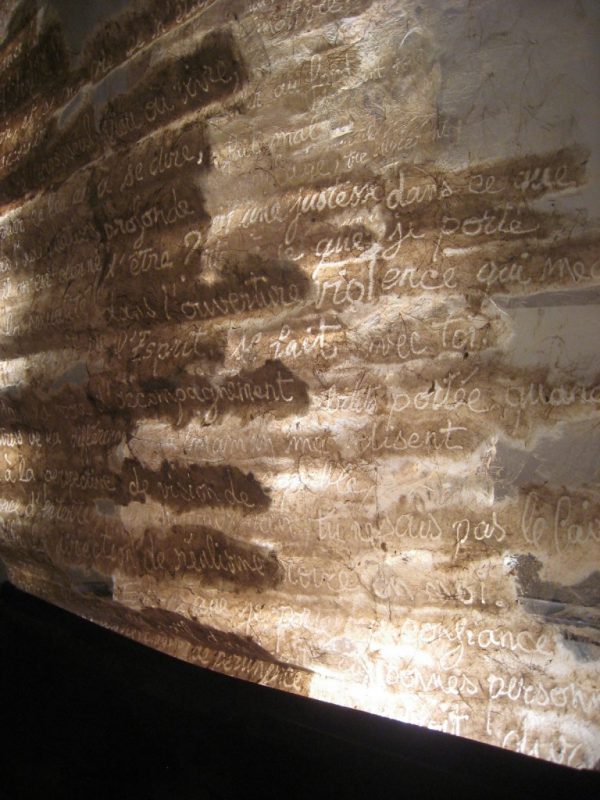 Dans l’audace des mots, je saisis des fragments de cette émotion intérieure, l’amène à l’expression, au jaillissement, j’accouche, me fait violence face aux peurs de montrer, face aux projections que j’ai, je m’accorde à dire l’attirance pour certaines matières, certaines personnes, certains thèmes et me laisse guider « à l’aveugle » jusqu’à ce qu’un certain nombre de liens soient faits, qui m’amène à mettre en œuvre.